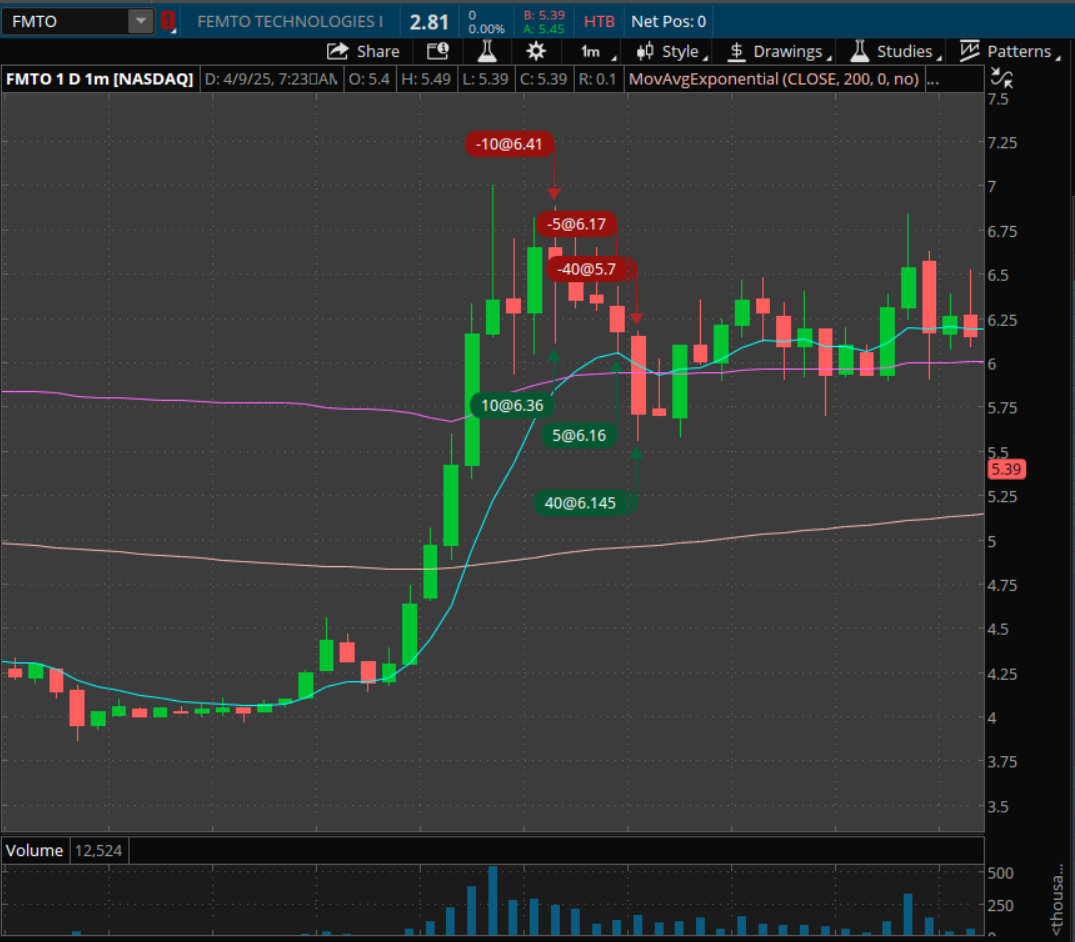 | April 9, 2025, 6:14 a.m. | Stock | FMTO | ThinkorSwim (TOS) | Default, | DipBuy/BreakOut, | Long | 5.00 | 30.80 |