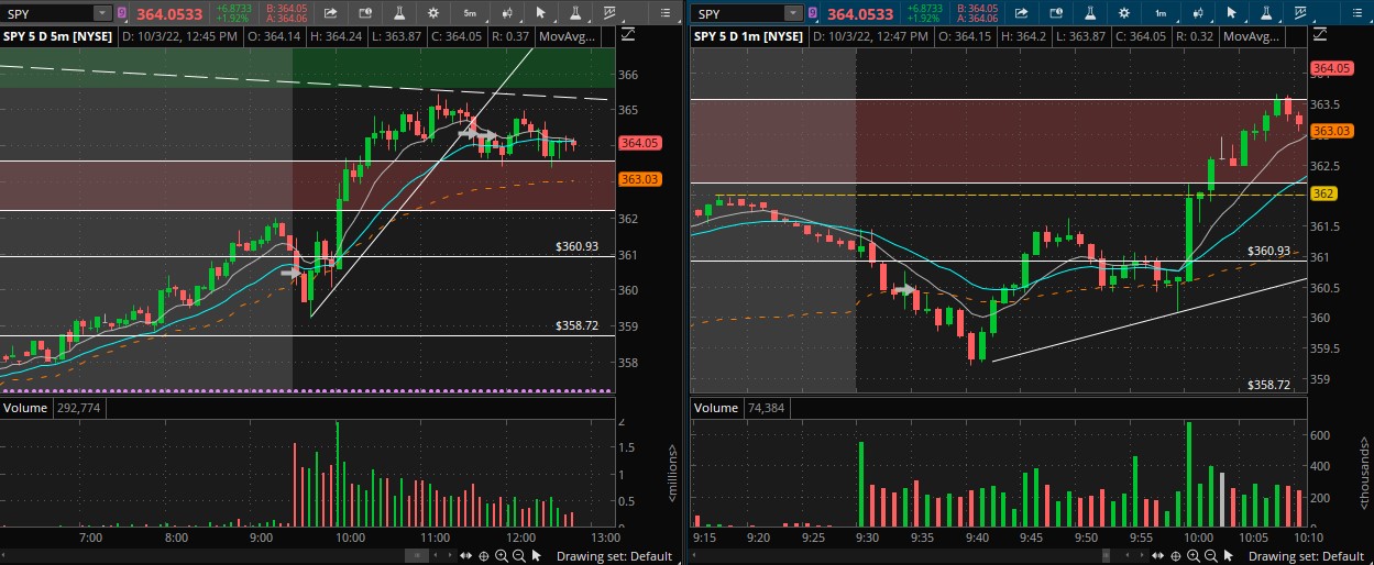 - NOTES: Gray Arrow 1 was a continuation short trade I was looking at. The markets in general were moving down strongly and the SPY had just tested VWAP and rejected back down on a green candle. It tested VWAP again and I did not get in because I did not want to rush a trade because of my 10:00 a.m. commitment. Gray arrow 2 and 3 are a much later trade for a break of the 5 minute uptrend. Specifically, the first of these 2 gray arrows was the fir pull-up off the move down and test of the 9 ema on the 1 minute. While I would typically like the 5 minute to test the initial trend and reject there, this was a strong move on high volume and only presented this entry. This would have been a solid play. The second arrow is the 3rd leg on the move and a rejection of the 20 EMA. This would have worked out as well, but because the 362-363 zone was looming it made it a little riskier.
