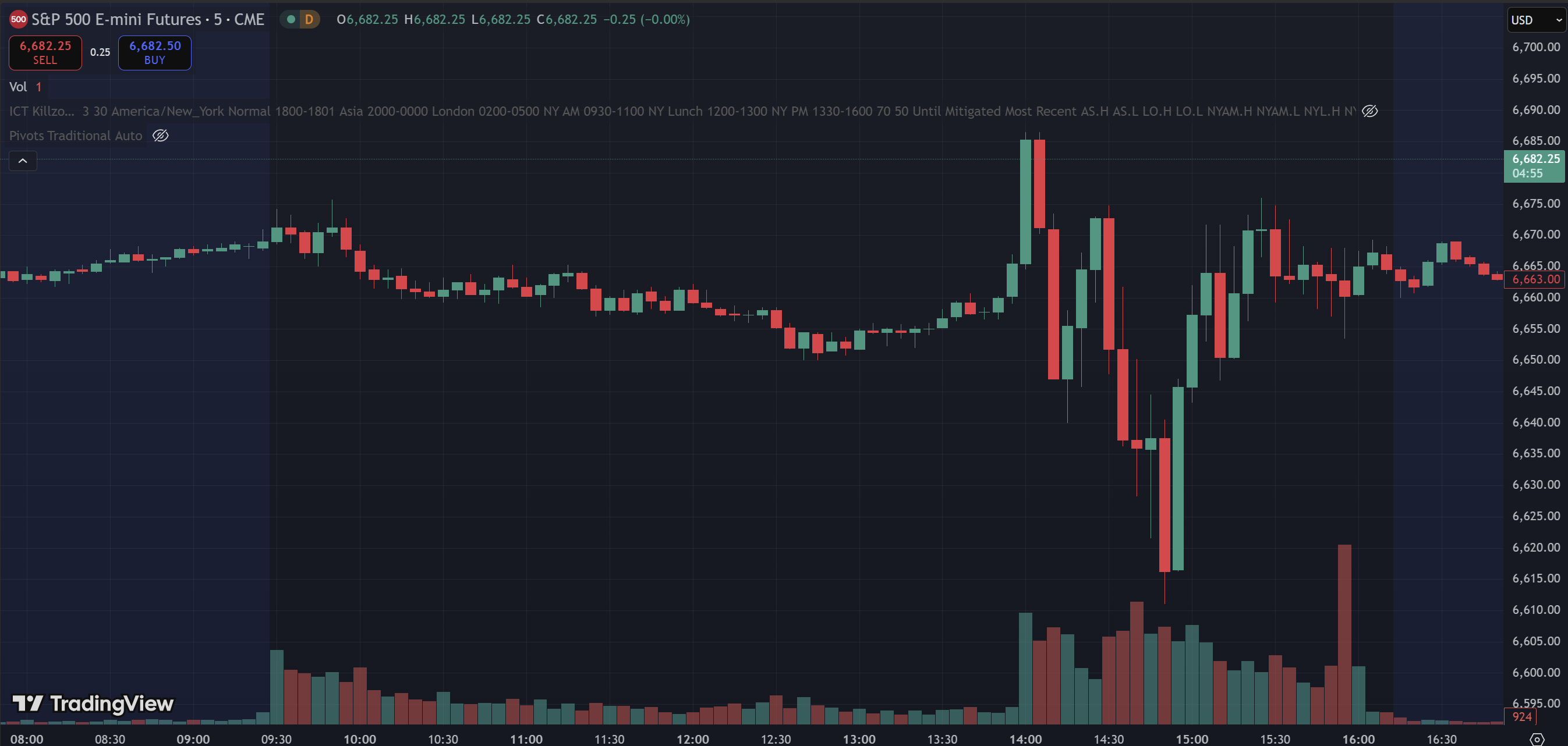 Day Summary: As soon as I woke up today I had that feeling that I shouldn't trade today and although I ended up green (which is something in the past I probably couldn't have acheived with that mindset) I did force two of my three trades. The final trade was one of the toughest holds I have ever experienced, especially with the mindset I was in, and it left me completely mentally exhausted by the time I finally got out. The trade took almost two hours by the time I covered my last contract, which is crazy considering my average hold time is probably between 2-10mins. Also, even though I was in the green pretty much the whole time, it was extra painful to watch it range for so long. The last point I want to make about today, and I unfortunately don't have screenshots of it, but Nas was relatively weak today comparfed to ES and it really was the instraument I should have been shorting. It was continuouslt making LH's and LL's while ES was wedging against a strong support. Maybe I should start charting MNQ and MES to give myself more options in terms of trading instrauments.