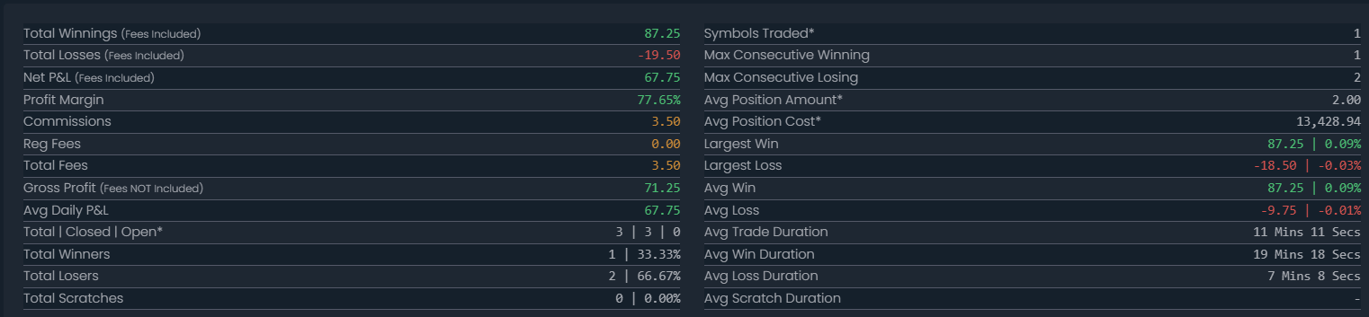 Day Summary: Pretty happy with today overall, but I did force a trade (Trade 2) in the chop based solely out of thinking about the money so that was not ideal. I was at least smart enough to put my stop at BE on that trade as soon as it went green. Trade 1 was a subpar set up but still a decent trade with managed risk so I am ok with that trade. Trade 3 was a playbooked set up but it was still taken out of annoyance and thinking about the money so even though I managed it well, it was a set up and I added to a winner, the main reason for taking the trade was not a good habit and can be dangerous.