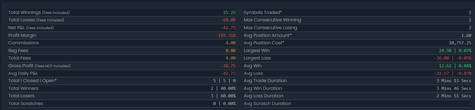 Day Summary: I really have been trying too hard recently. Not waiting for the market to present good set ups to me. I have taken some according to set up, but they are typically subpar and not with the mindset of what kind of day we are having. We have been chopping a lot recently in the mornings, and I had been taking trend continuation set ups at the lows. I need to do a better job of recognizing what kind of day it is, and adjusting to that. I should be looking for range fakeout trades when it gets choppy. I also missed a good trade on the funded account just before the open because my order didn't get filled, so that did send me into the open with some FOMO.