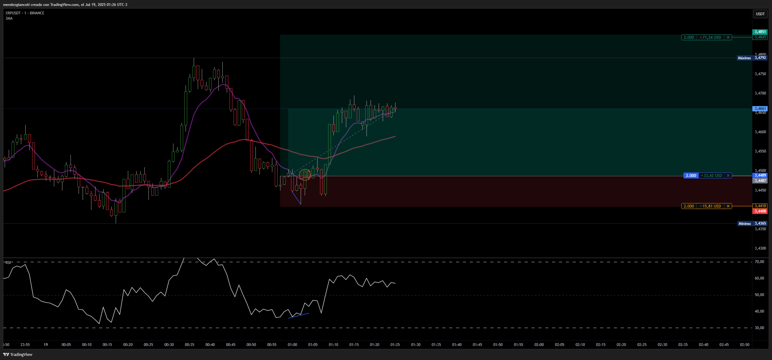 El trade se produjo debido a que en en grafico de 15 Min de XRP es alcista , en 5 min tiene tendencia la alza pero tiene una pequeña divergencia , que puede barrer dado que no llego al limite del RSI aun , la entrada se realizo debido a que en 1 Min el precio tenia divergencia en el retroceso y se encontraba con una zona de soporte de un minimo anterior. El trade es RATIO 1:4 (PRIMER TRADE) de la estrategia creada con chatgpt , "Divergencia Dinamica"
