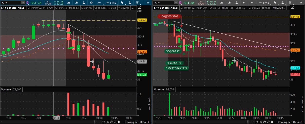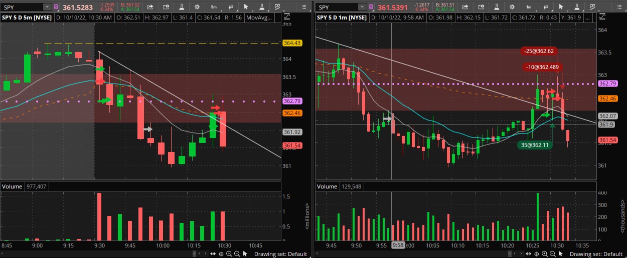 - NOTES: Gray Arrow 1 was a continuation downside trade that Iw as considering taking. The market has been moving down on a trend consistently and was consolidating with resistence at 362. I was worried that it was Monday and 10:00 a.m. approaching when we typically have a reversal so I was a little hesitant. This would have worked for 50c at least. Gray Arrow 2 (at around 10:35) was a continuation downtrend after a strong rejection of the trend break on super high volume. This was a clean trade however I hesitated because we recently had the big move green on high volume. This was immediately sold into though, must have been someone covering a short.