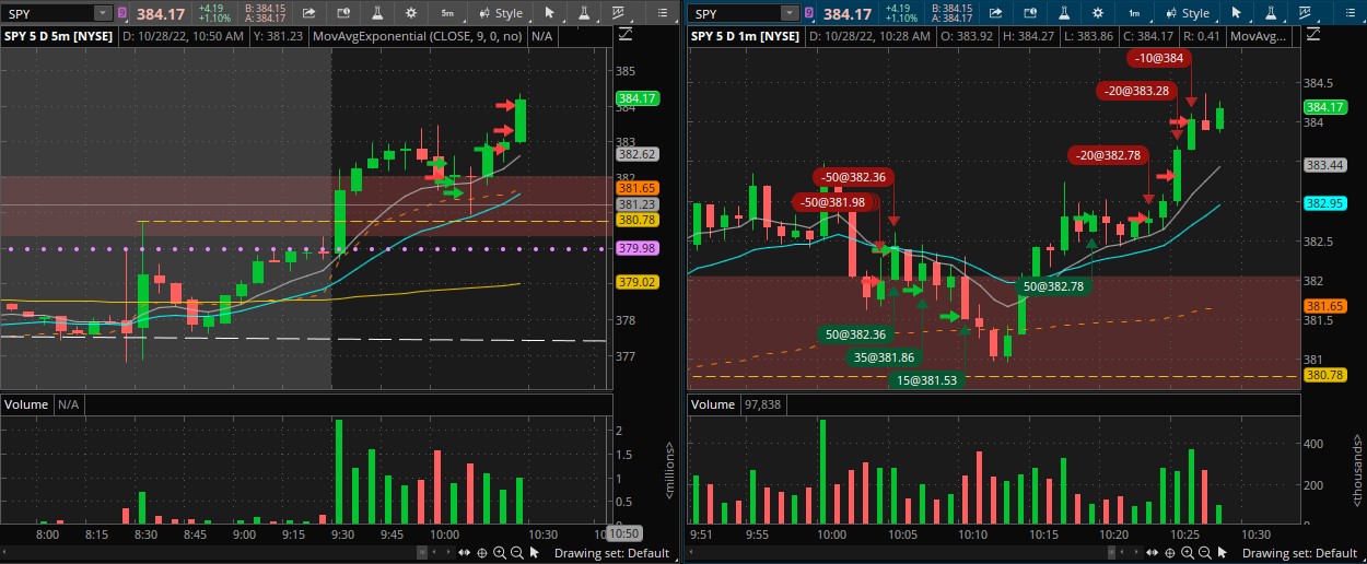 - Trade 3 was a continuation long trade on the 5m chart and a continuation of a strong bounce around VWAP. We got the first leg and pulled back some on low volume so I got in. My entry was a little high so I was a little nervouse and took 20 shares off at even. After that I took my partial at 50c and the rest at over $1 around the 384 level which I thought would be resistance. The only things I would change about this trade was get a better fill and not take those 20 shares prematurely for no reason. If I had confidence in my trade it would have been a much larger trade.