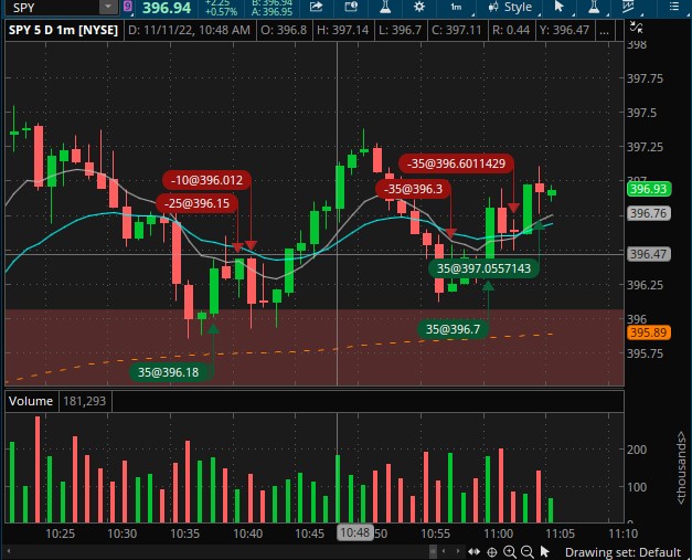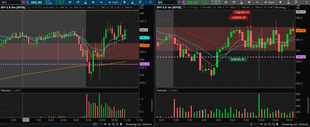 Overview: Yesterday was a little uncontrolled for me and I overtraded because I was seeing big moves and felt FOMO I guess. The SPY had one of its biggest green days ever and ended up close to 20 pts higher than where we started before CPI. CPI numbers came back better than expected and the market tends to think the Feds will be loosening up on the rate increases (which I have a feeling they still aren't). As a result, we moved green all day. This also invalidated a lot of zones that we had previously drawn. On the daily chart we had a big gap up and broke the previous high at 390 without any problems. The 200 EMA on the daily is presently sitting at 401.62. I find it hard to believe that we continue to move up today without some sort of release but I can't go into the market thinking like that, as that's what got me red yesterday. Yesterday we blasted through a ton of zones, and played within the 388-390 zone for a while before moving up, although this zone really did not have that much traction and volume around it, potentially invalidating it. Our next zone up is the 395-396 zone I have drawn from 9/13. Above that we meet heavy resistance at 400 and the 200 EMA which are about lining up. Potential scenarios: